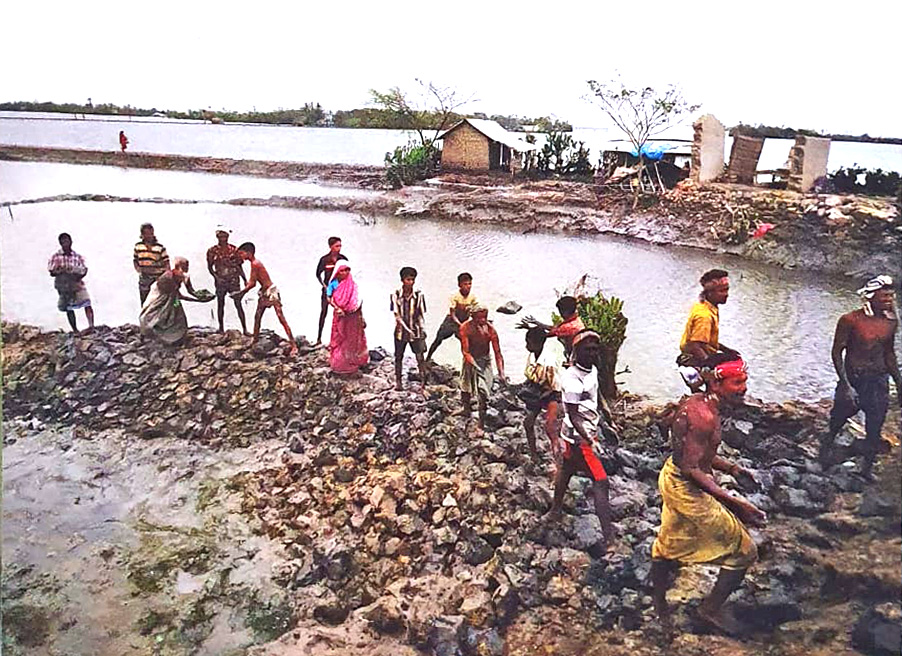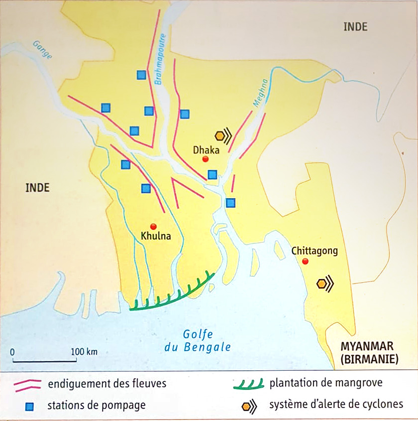 « Un peu partout, sur le littoral, le gouvernement du Bangladesh et les ONG construisent des digues et plantent des arbres afin de proteger les villages. Plus de 2 500 refuges anti-cyclones ont ete construits, et l on experimente de nouveaux concepts, comme les fermes flottantes, qui consistent a faire pousser des legumes sur l eau. A Dhaka, des chercheurs bangladais ont egalement mis au point de nouvelles varietes de riz, resistantes au sel. Depuis 2010, la Banque mondiale a investi plus de 600 millions de dollars dans des projets locaux d adaptation au changement climatique. Parmi les plus gros contributeurs, les Etats-Unis. Juste retour des choses, de la part de l un des plus gros pollueurs de la planete : un Americain produit autant de gaz a effet de serre que 97 Bangladais. »